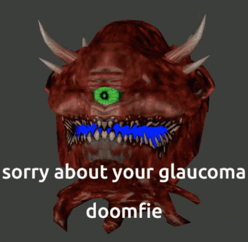 Descrierea conținutului: a red monster with a green eye and the words sorry about your glaucoma doomfie on the bottom