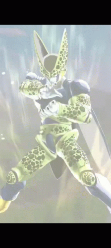 Descrierea conținutului: a cell from dragon ball z is jumping in the air while holding a sword .