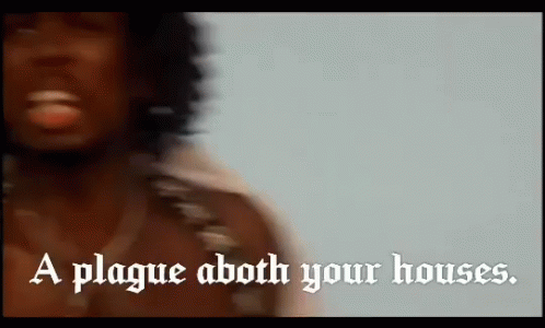 Descrierea conținutului: a blurry picture of a man with the words " a plague a both your houses "