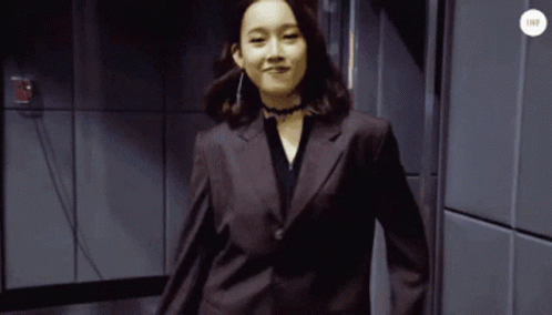 Descrierea conținutului: a woman in a suit and choker is standing in front of a wall that says try