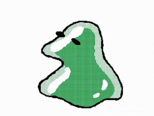 Описание контента: a pixel art drawing of a green ghost with a black nose
