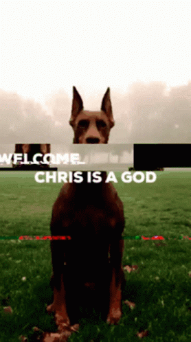 உள்ளடக்கத்திற்கான விளக்கம்: a dog is standing in a field with the words welcome chris is a god above it