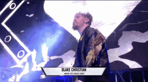 คำอธิบายเนื้อหา: a man named blake christian is standing in front of a large screen