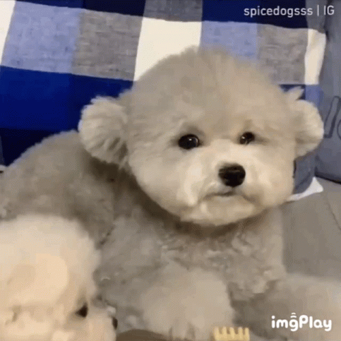 İçerik Açıklaması: a small white dog is laying on a blue and white plaid blanket .