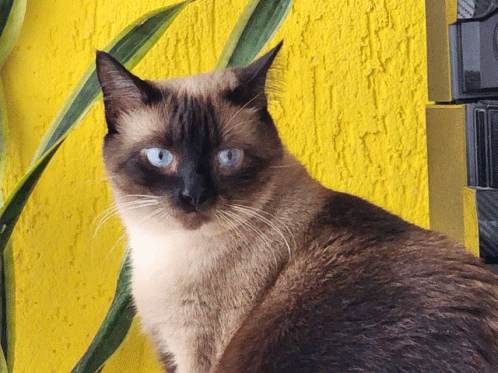 Опис контенту: a siamese cat with blue eyes sitting in front of a yellow wall