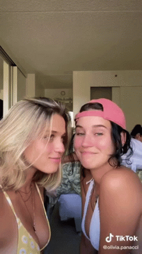 Mô tả nội dung: two women are standing next to each other and one has a pink hat on and the other has a bikini top on