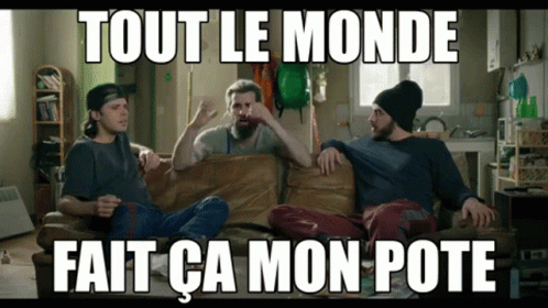 Content Description: three men sitting on a couch with the words tout le monde fait ca mon pote