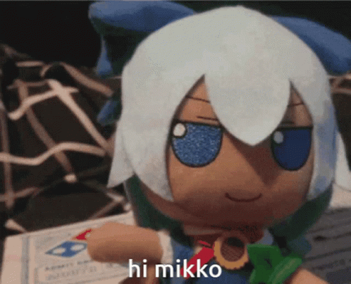 Content Description: a stuffed doll with white hair and blue eyes says hi mikko on a piece of paper