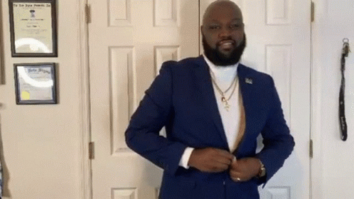 Content Description: a man wearing a blue suit and a gold necklace is standing in front of a door .