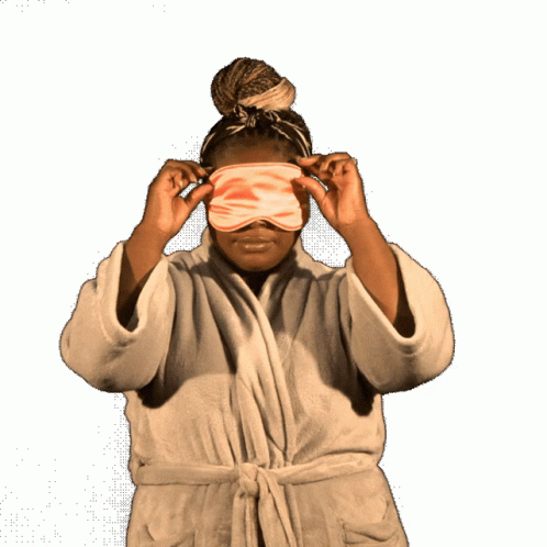 Content Description: a woman in a bathrobe is wearing a sleep mask on her eyes