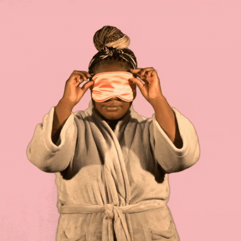 Content Description: a woman in a bathrobe with a sleep mask on her head says good morning