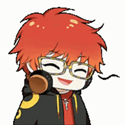 Content Description: a pixel art drawing of a boy with red hair and glasses wearing headphones .
