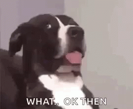 内容说明: a black and white dog is sitting on a couch with its tongue out and says `` what . ok then '' .