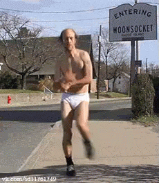 内容说明: a shirtless man in white underwear is running down a street in front of a sign that says entering woonsocket