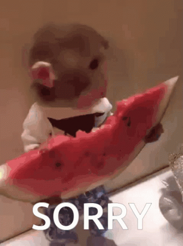 内容说明: a stuffed animal is holding a slice of watermelon with the word sorry written below it