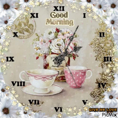 Incazelo Yokuqukethwe: a clock that says good morning with two cups of tea on it