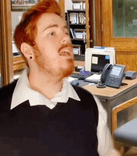Incazelo Yokuqukethwe: a man with red hair and a beard is sitting at a desk in front of a phone .