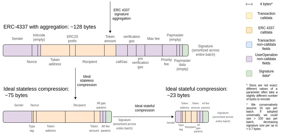 tx.origin. ERC-4337, by itself, makestx.originreturn the address of the "bundler" that packaged up a set of user operations into a transaction. Native account abstraction could fix this, by makingtx.originpoint to the actual account sending the transaction, making it work the same way as for EOAs.It's worth zooming into the gas efficiency issue further. In its current form, ERC-4337 is significantly more expensive than a "basic" Ethereum transaction: the transaction costs 21,000 gas, whereas ERC-4337 costs ~42,000 gas. This doc lists some of the reasons why: