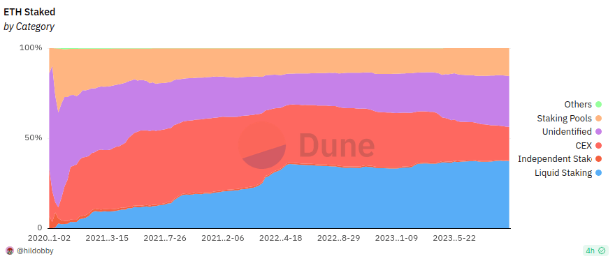 Each version of staked ETH needs to have some mechanism determining who can be the underlying node operators. It can't be unrestricted, because then attackers would join and amplify their attacks with users' funds. Currently, the top two are Lido, which has a DAO whitelisting node operators, and Rocket Pool, which allows anyone to run a node if they put down 8 ETH (ie. 1/4 of the capital) as a deposit. These two approaches have different risks: the Rocket Pool approach allows attackers to 51% attack the network, and force users to pay most of the costs. With the DAO approach, if a single such staking token dominates, that leads to a single, potentially attackable governance gadget controlling a very large portion of all Ethereum validators. To the credit of protocols like Lido, they have implemented safeguards against this, but one layer of defense may not be enough.