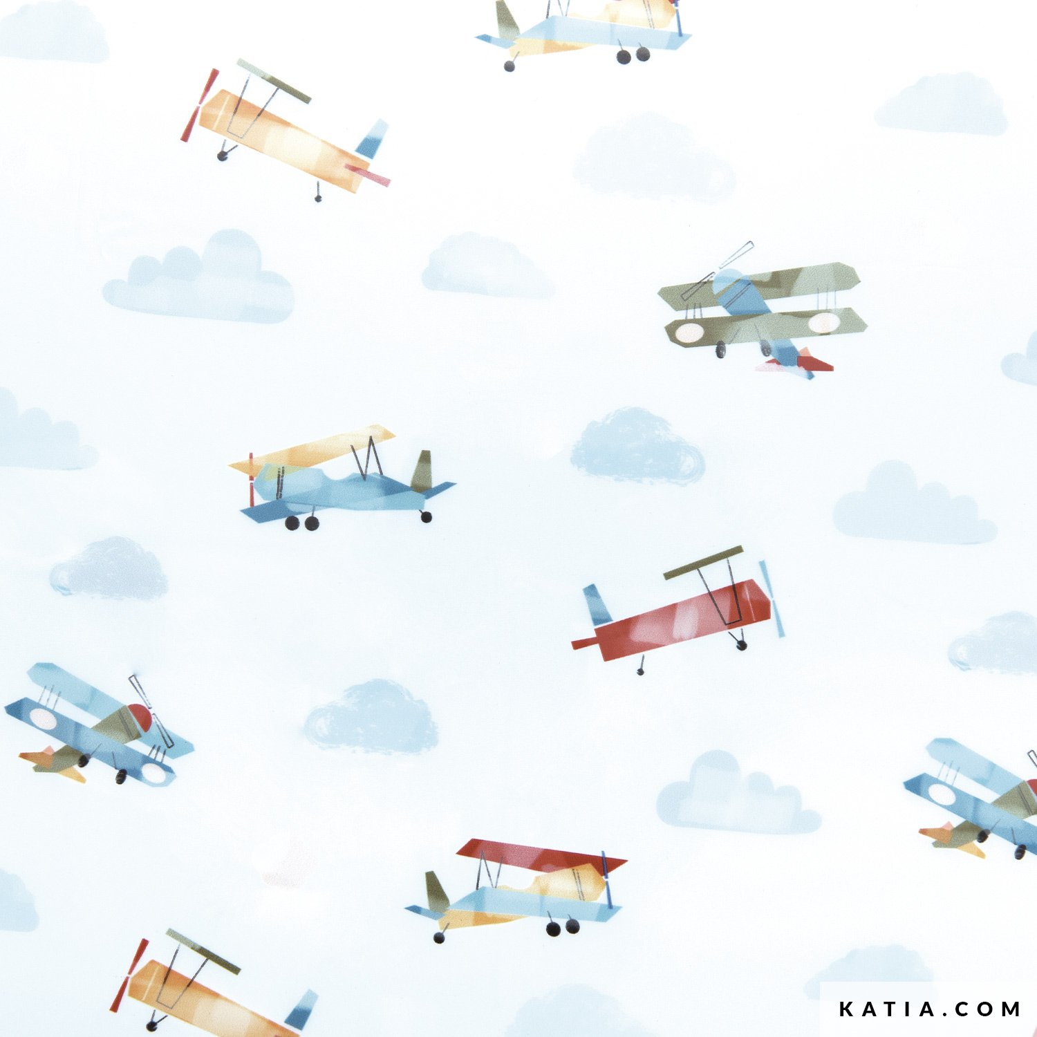 Originele waterdichte stof met een print van vliegtuigjes en wolken op een doorschijnende achtergrond. Ideaal voor het maken van regenjassen, regencapes en allerlei soorten accessoires.