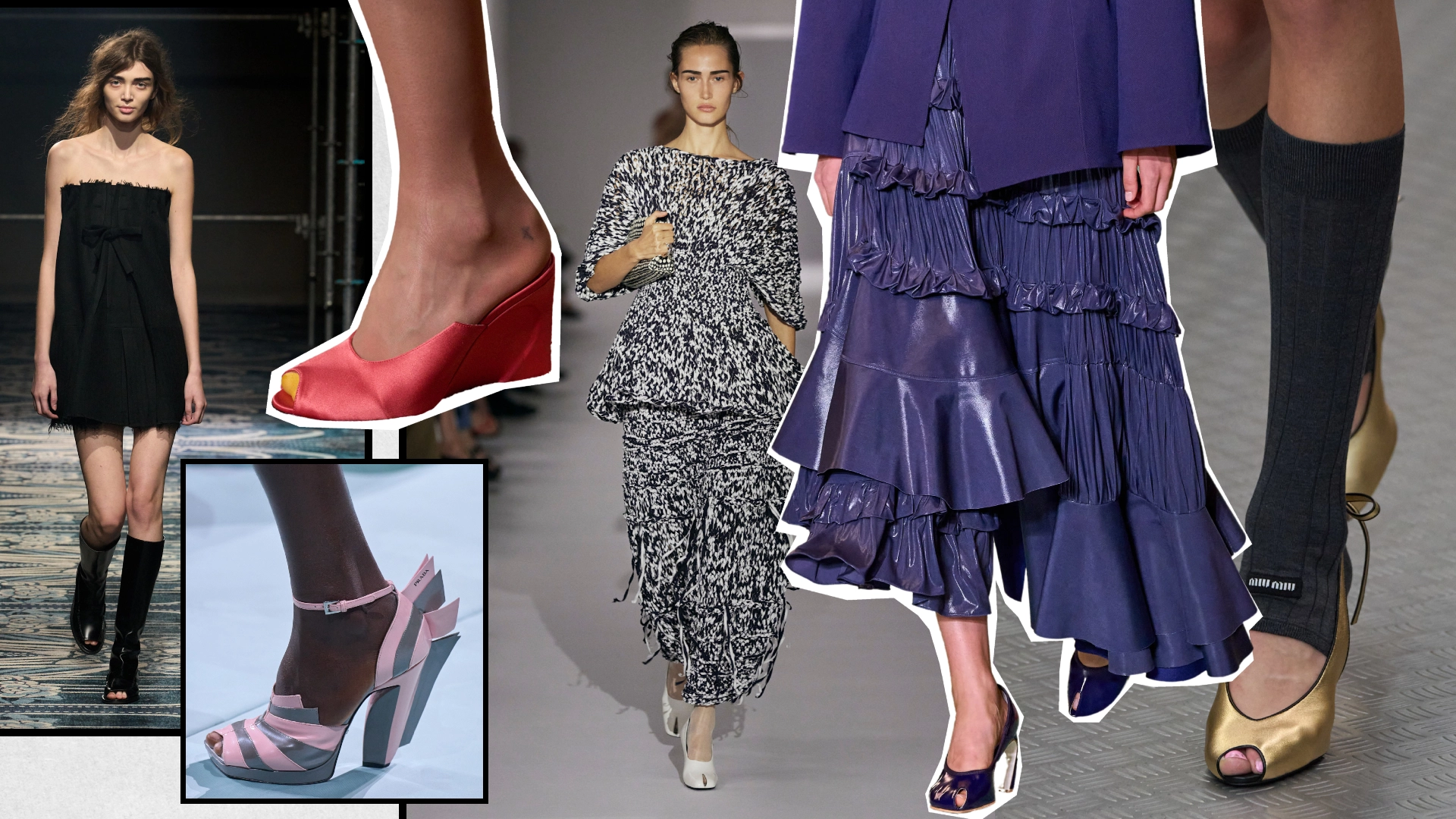The coy approach to peep-toes continued as Fashion Month progressed. Catherine Holstein of Khaite unveiled front-slit pumps that New York women instantly crowned their number-one in-the-know spring shoe. Acne Studios made its enthusiasm for toe-forward designs unmistakable, with slouchy knee-high open-front boots adorned in patent and florals. Meanwhile, Prada revived its frilled peep-toe platforms, first shown in Fall 2008, and at Miu Miu, Mrs. Prada doubled down on the toe-centric trend by showcasing cone heels with a missing chunk at the cap.