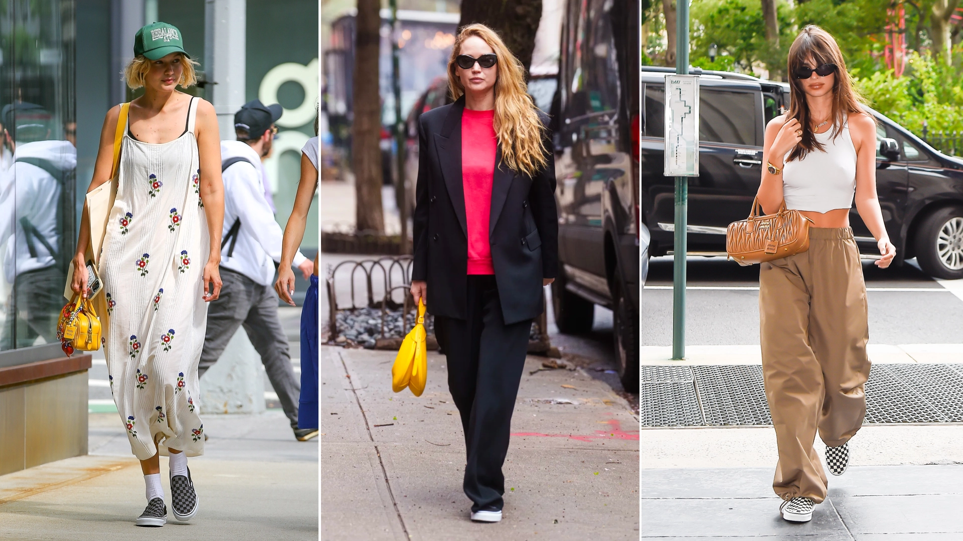 By late July, the Vans sneaker trend had made its way to Hadid and Ratajkowski. With her Kelly green trucker hat, white tube socks, and a sliver of a black bralette peeking out from underneath the silk slip, Hadid tapped into the shoe's inherent punkiness. Ratajkowski, on the other hand, opted for baggy khaki trousers and a strappy white tank top when she wore her checkered favorites.