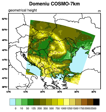 Folosind o rezolutie orizontala de 7km, modelul de predictie pe arie limitata COSMO este rulat pentru o anticipatie de 78 de ore, avand un numar de 40 de nivele verticale. Domeniul de integrare (201×177 puncte de grila) este centrat pentru a acoperi suficient de bine teritoriul Romaniei (figura 1). Conditiile initiale si la limita folosite pentru rularea modelului COSMO la o rezolutie de 2.8 km sunt obtinute aplicand o procedura de interpolare a rezultatelor rularii modelului la o rezolutie orizontala de 7km. Modelul este rulat multi-procesor pentru o anticipatie de 30 de ore, avand 50 de nivele verticale. Domeniul de integrare numerica cuprinde 361×291 puncte de grila (figura 1).