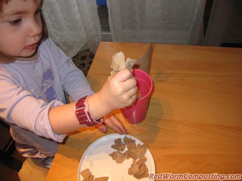 This morning Adaia was eager to take a closer look at her new friends, so we dumped out the contents of the cup and I tracked down 4 or 5 wigglers. While the idea of holding them really seemed to appeal to her, I couldn’t quite get her to commit. She was however more than happy to feed them some cut up pieces of banana, and then help me to set up the cup like regular worm bin.