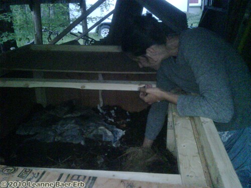 I must say right off the bat that the big wooden bed – built by Leanne Erb’s husband David – is every bit as impressive (more so, in fact) than it appeared to be in the photos Leanne sent me (included in this post: “Silver Lake Vermicomposting-06-11-10“)!