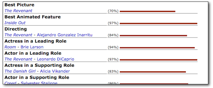 Voting in our annual Predict the Academy Awards contest is now closed, and we can reveal the final vote totals in each category, along with the rough probability for which film will win each award. This is a year where readers are very confident about the outcomes in many of the categories. In fact, there isn’t a single major category where less than 50% of readers picked the same winner, and there are five Oscars where 90% or more of readers agreed on the outcome, including a massive 97% of the vote for Inside Out for Best Animated Feature. That makes The Revenant a rather more uncertain bet, with 70% of readers favoring it for Best Picture. That’s actually theoretically the closest call among all the major prizes…