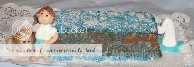 Este foi o bolo de batizado do Daniel, um menino especial. As peças do puzzle representam o autismo e os restantes elementos estão ligados ao mar, que foi o tema escolhido para o batizado.