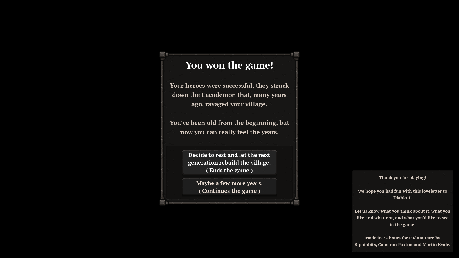Lovely game. Needs some polish, harder difficulty and more player agency but still a really fun love letter to diablo. Would love to see a version of this were player can influence the heroes builds with a talent tree, and better agency in party composition and flee mechanics. Not that i care if they die but truth be told there needs to be something for the player to do because as is you as Deckard Cain could easily be automated and you would still beat the game easily. <3