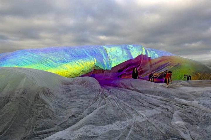 At dawn, crowds formed around a giant and colorful, circular foil, pinned to the ground at the edges with sand bags. Throughout the morning, the artist and his team gradually filled the foil with air and visitors could walk through this stunning colored wonderland.