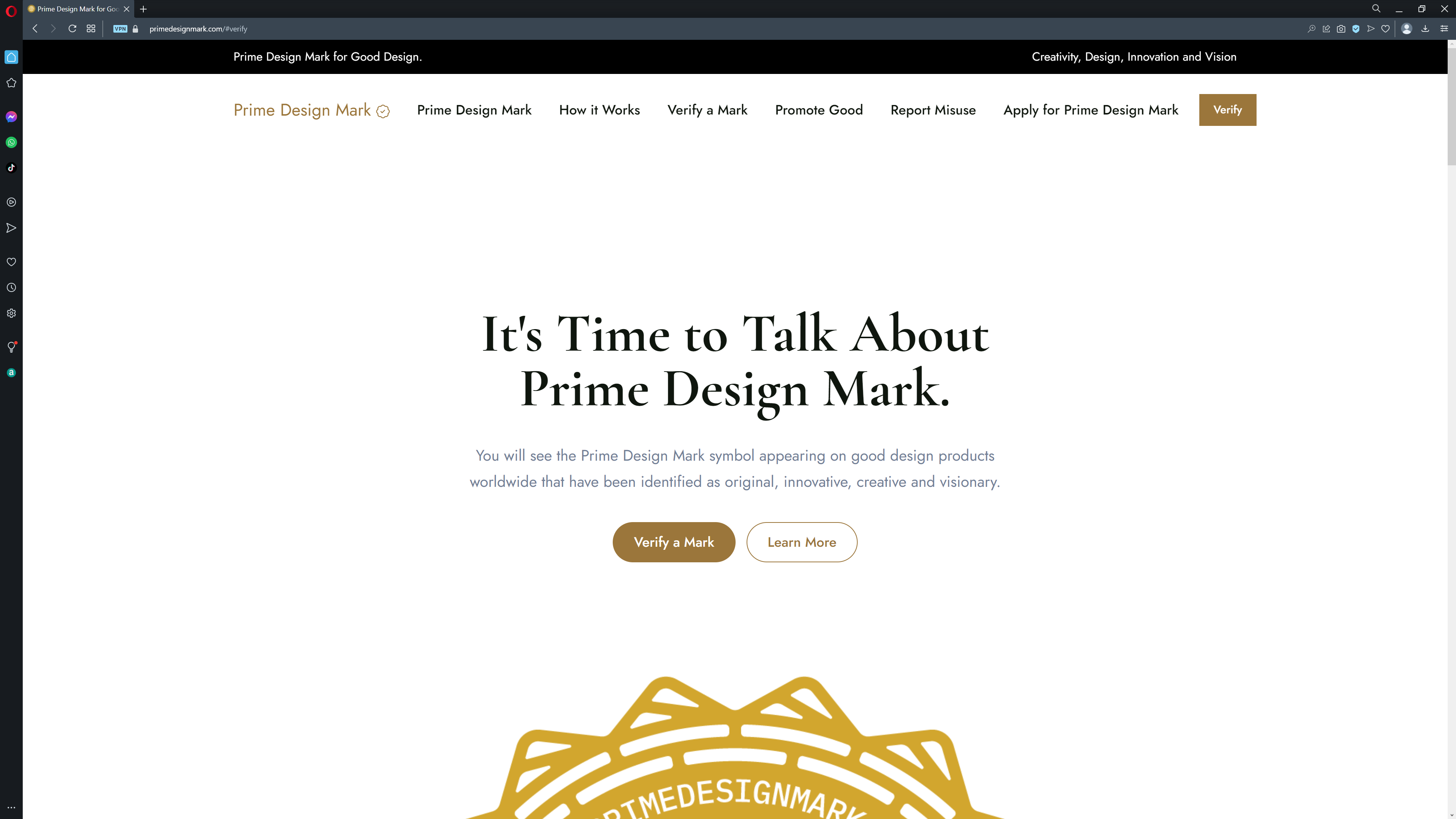 |   About Prime Design MarkPrime Design Mark is a symbol on products & product  packages that communicates the intrinsic design value embedded within designs.  The Prime Design Mark is a verifiable symbol, making it hard to be used without  permission; during verification process the image of the verified product is  shown; this system was designed to ensure that third parties cannot use the  Prime Design Mark on product packaging or products without getting marked as  invalid.
