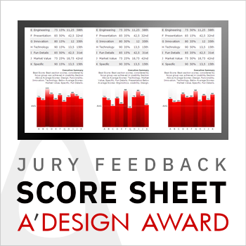 Marketing ValidationA' Design Award's jury feedback and score sheet mechanisms ransforms the design competition from a modest award program into a rich comprehensive professional development and market validation platform. The A' Design Award's methodology and voting system that provides feedback and scoresheet to its entrants creates a "learning loop" where every submission, regardless of winning status, becomes a valuable professional development opportunity. This transforms the traditional win/lose paradigm into a win/learn model, where even non-winning entries generate significant value through detailed feedback and benchmarking data. This makes participation valuable beyond just winning, creating a unique return on investment for every participant while simultaneously raising industry standards through systematic feedback and improvement guidance.
