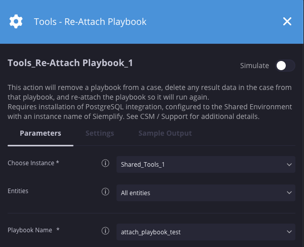 Playbook Name | Dropdown | N/A | Yes | Specify the playbook to re-attach. |
