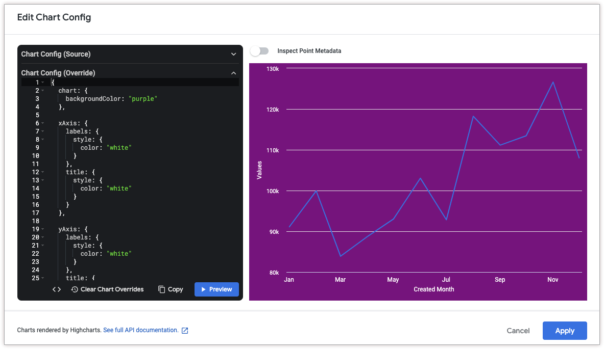 - Enter some valid HighCharts JSON in the Chart Config (Override) pane. You can use the text that you copied in step 2 as a template, but be sure to test your changes using the Preview button to ensure there are no conflicts.