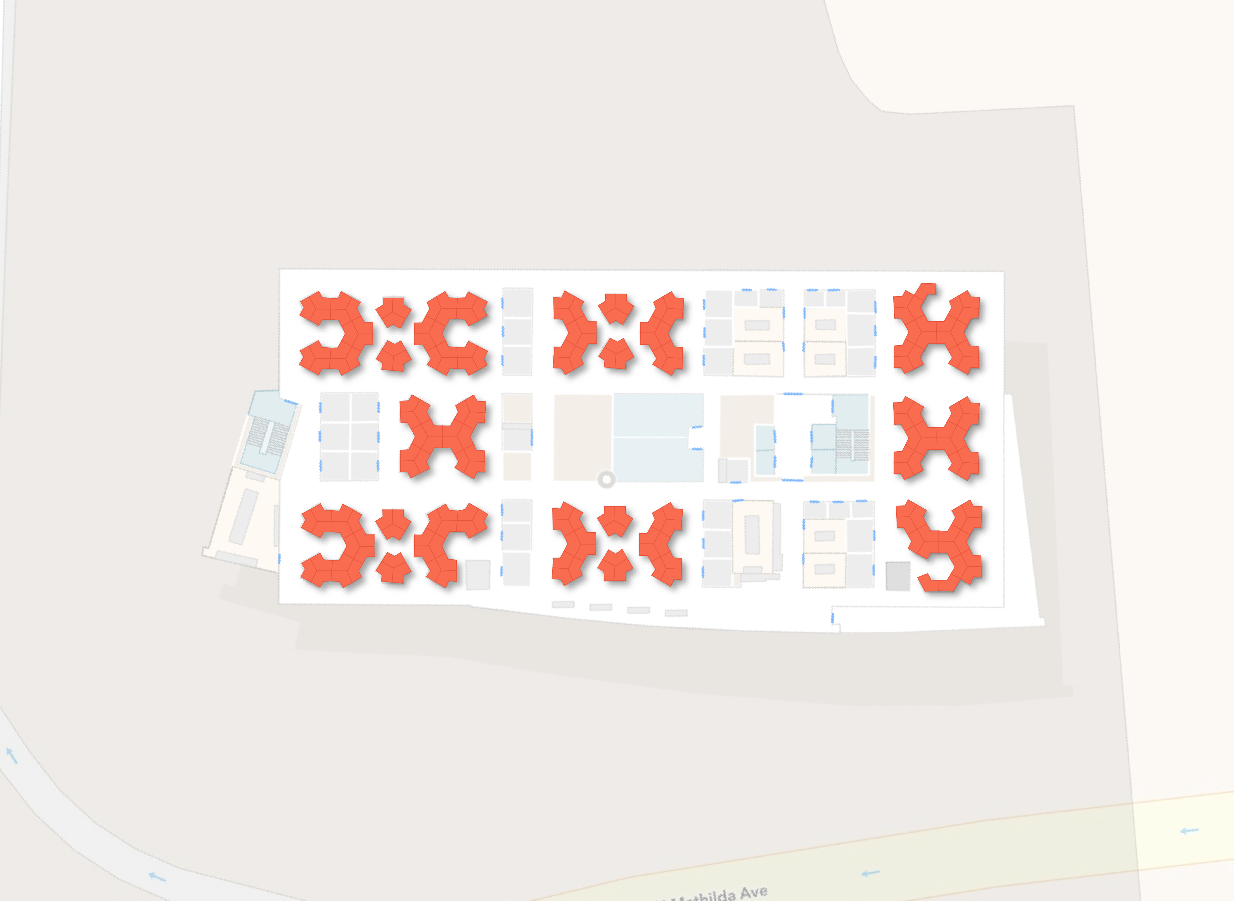 In the context of a business campus, each cubicle (highlighted) is a pedestrian destination. The area in which cubicles are located also functions as a pathway leading to offices, conference rooms and other functional areas. Some pedestrian pathways among cubicles can be inferred, while others are more subjective. The extent and location of pedestrian pathways is largely defined by the cubicles themselves. With neither a reasonable way of defining the extent of a "room" Unit, nor a "walkway" Unit around cubicles: