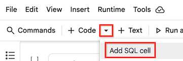 Na barra de ferramentas, para adicionar uma célula SQL, clique no menu Opções de inserção de células de código e selecione Adicionar célula SQL.