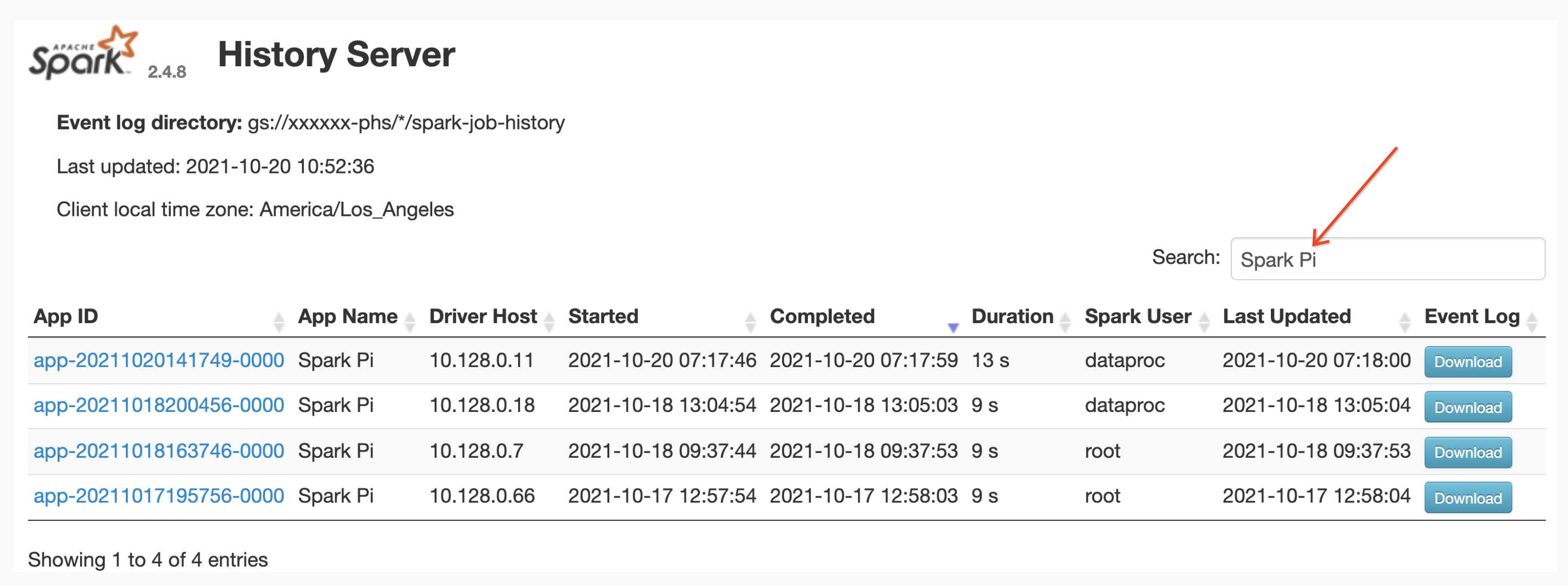 In the in the Google Cloud console, from the Dataproc Clusters page, click PHS cluster name to open the Cluster details page. Under the Web Interfaces tab, select the Component gateway links to open web interfaces running on the PHS cluster.