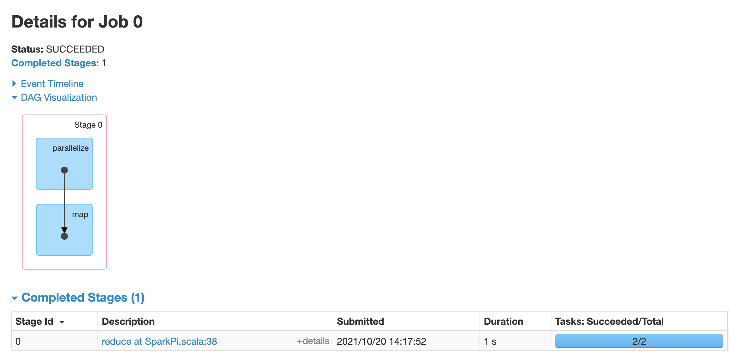 • Click a Spark App ID in the web interface to open the Spark Jobs page, which provides an event timeline and summary of jobs within the application.