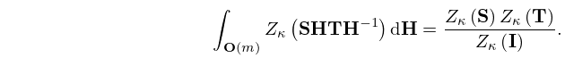 See Muirhead (1982, pp. 68–72) for the definition and properties of the Haar measure . See Hua (1963, p. 30), Constantine (1963), James (1964), and Macdonald (1995, pp. 425–431) for further information on (35.4.2) and (35.4.3). Alternative notations for the zonal polynomials are (Muirhead (1982, pp. 227–239)), (Takemura (1984, p. 22)), and (Faraut and Korányi (1994, pp. 228–236)).