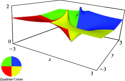 In the graphics shown in this subsection height corresponds to the absolute value of the function and color to the phase. See also About Color Map.