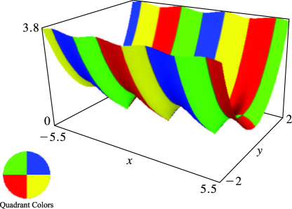 In the graphics shown in this subsection height corresponds to the absolute value of the function and color to the phase. See also About Color Map.