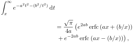 7.7.7 xea2t2(b2/t2)dt=π4a(e2aberfc(ax+(b/x))+e2aberfc(ax(b/x))),