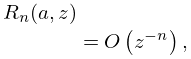 If a is real and z (=x) is positive, then Rn(a,x) is bounded in absolute value by the first neglected term un/xn and has the same sign provided that na1. For bounds on Rn(a,z) when a is real and z is complex see Olver (1997b, pp. 109–112). For an exponentially-improved asymptotic expansion (§2.11(iii)) see Olver (1991a).