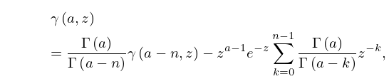 8.8.7 γ(a+n,z)=(a)nγ(a,z)zaezk=0n1Γ(a+n)Γ(a+k+1)zk,
