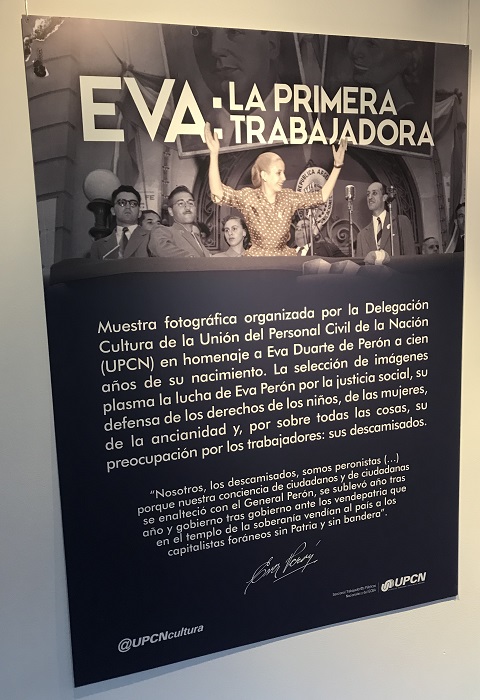 El miércoles 22 de mayo se llevó a cabo en la Biblioteca Nacional Mariano Moreno la inauguración de la muestra fotográfica Evita, la primera trabajadora. Previo a la misma, la organización gremial de trabajadores estatales Unión Personal Civil de la Nación (U.P.C.N.) descubrió en el hall de entrada del organismo una placa en honor al centenario del nacimiento de la dirigente del pueblo obrero en el terreno de la que fuera la residencia presidencial a la hora de su muerte.