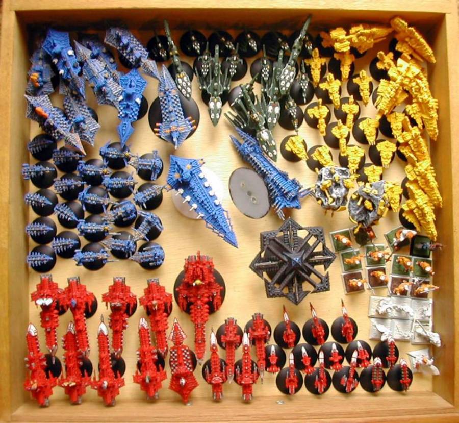 Il traine, il traine. Mais au moins, j'ai sorti des cartons 2 autres vaisseaux du Chaos, déjà peints, pour me remettre en tête le schéma de peinture. En tout cas, il faut absolument que je le peigne car Parodius m'a pris en otage : si je peins celui-là dans les temps, il commence à peindre sa propre flotte (en faisant avance ce projet-là de plusieurs places dans sa liste de choses à peindre prioritairement). Là, ce n'est même plus une APO. En fait, je ne sais pas comment appeler ça. En tout cas, c'est moche, c'est indécent. Ca ne devrait pas se faire.