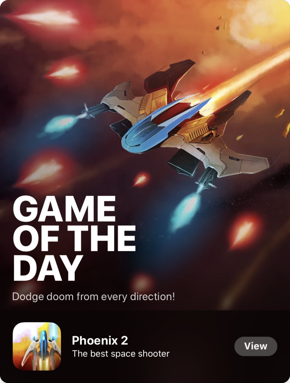 Phoenix 2 has been featured world-wide on the App Store as Game of the Day. Phoenix 2 has also been featured in Apple Retail Stores around the world, to showcase the 120Hz ProMotion displays of the iPad Pro. Our App Clip implementation also has been widely praised.